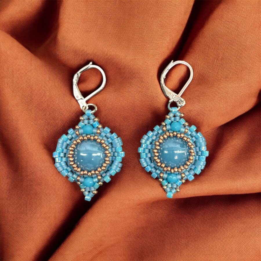 Kombinace tyrkysových odstínů a zlatavých akcentů působí svěže, moderně a zároveň luxusně. Náušnice jsou ručně šité s maximální přesností, díky které má každý pár perfektní tvar, pevnost a dlouhou životnost.