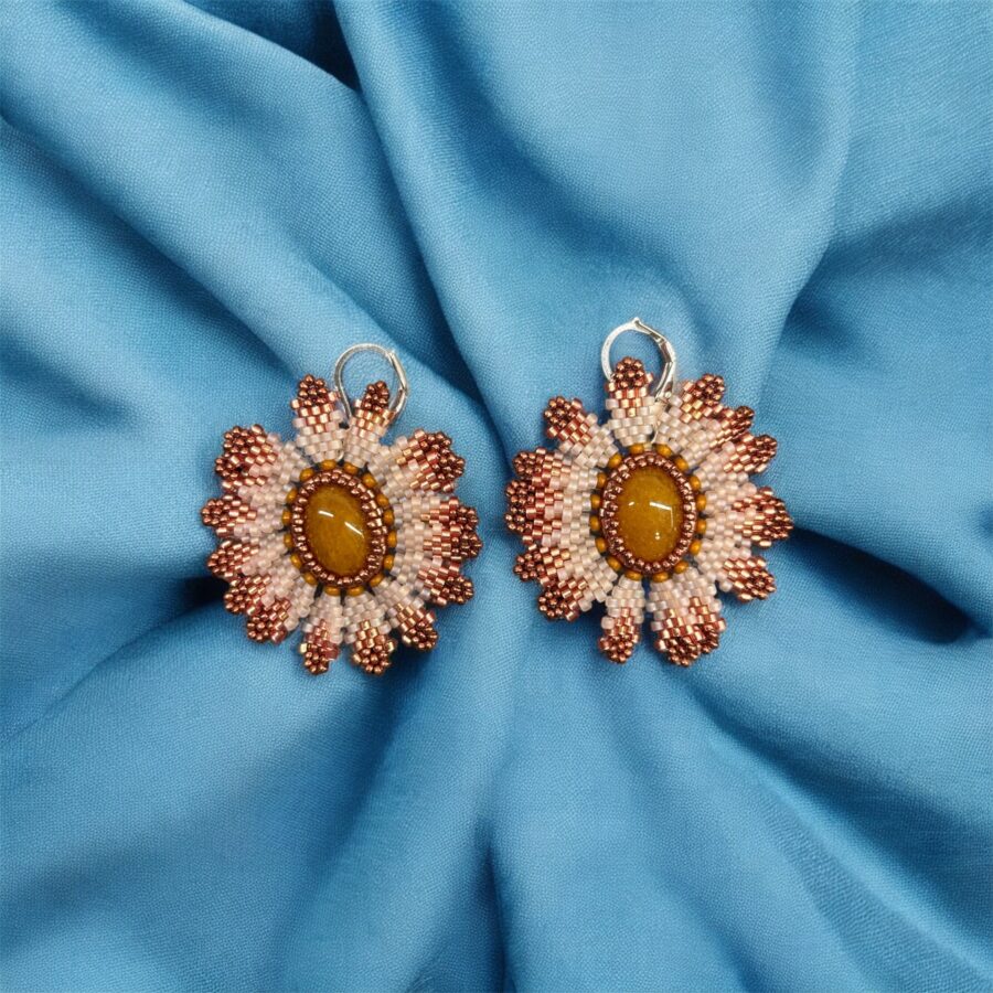 Květové náušnice v bronzovo-krémové paletě s medovým středem. Elegantní, ručně šité a jedinečné.