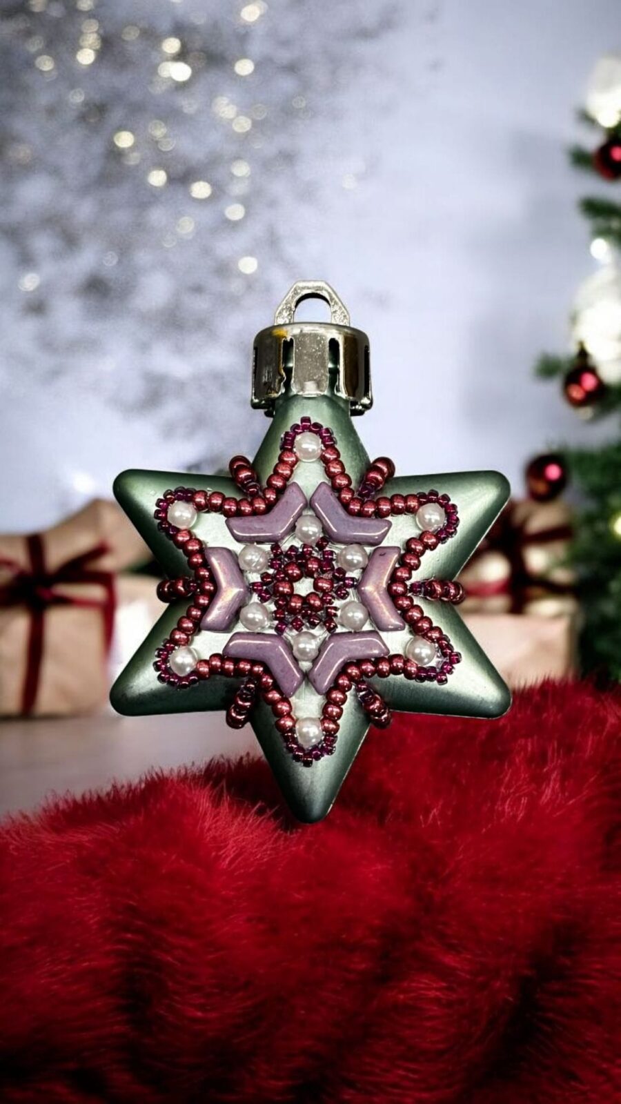 Elegantní zelená vánoční hvězda s vínovou a fialovou korálkovou výšivkou a perlami. Klidná a slavnostní dekorace.