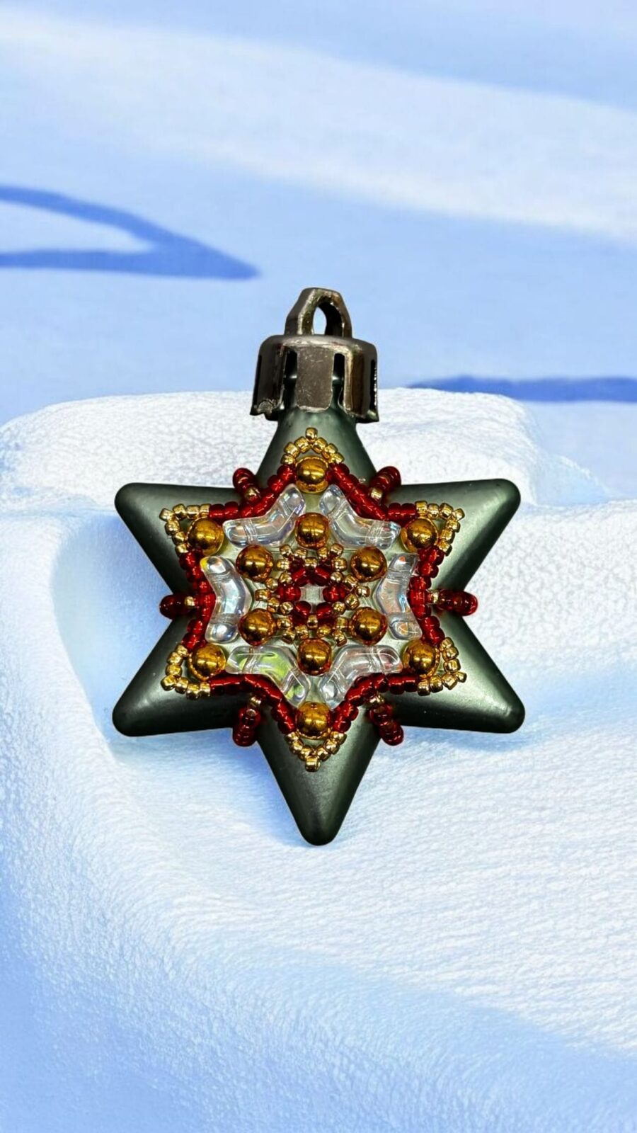 Hvězda Zimního triumfu je přesně ten typ vánoční ozdoby, který na stromku nepřehlédnete. Tmavý základ dává vyniknout zlatému středu, průsvitným skleněným korálkům a sytě červeným detailům, které vytvářejí luxusní kontrast a silný slavnostní výraz.