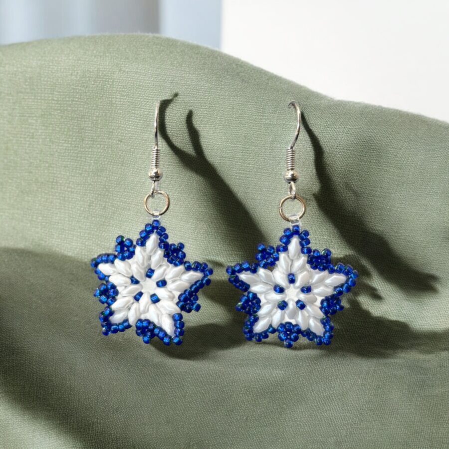 Výrazné ručně vyráběné náušnice ve tvaru sněhových vloček – perfektní zimní doplněk s nádechem elegance.