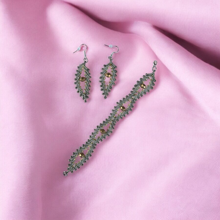 Každý prvek je ručně šitý s citem pro detail a symetrii. Náramek krásně sedí na zápěstí, náušnice jemně rámují tvář a celek působí velmi harmonicky. Skvělá volba pro ženy, které chtějí působit přirozeně a zároveň originálně.