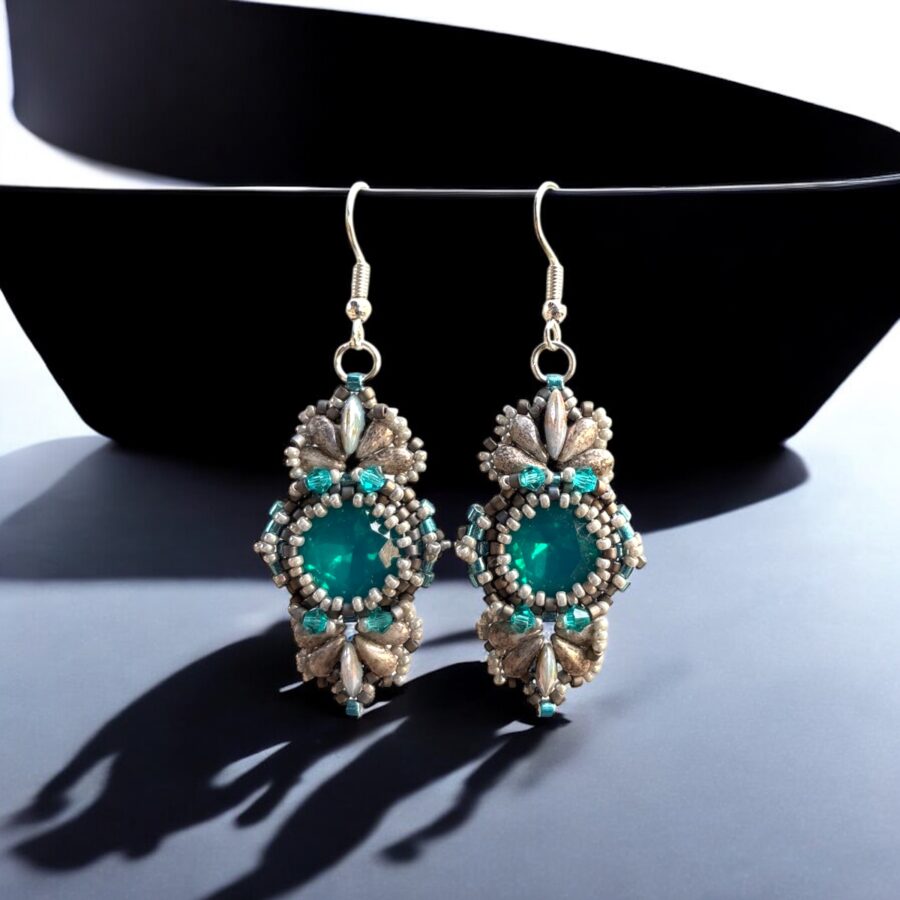 Elegantní ručně vyráběné náušnice v tónech tyrkysové a perleťově zlaté. Jemný, ale nepřehlédnutelný doplněk pro ženy, které milují svěží a harmonický styl.