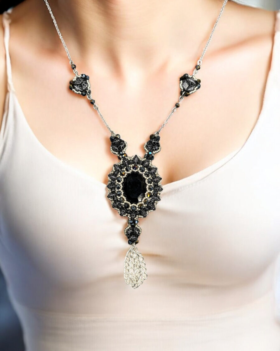Luxusní ručně vyráběný náhrdelník s dominantním černým kamenem, bohatým korálkovým zdobením a jemným závěsem. Elegantní, výrazný a ideální pro slavnostní příležitosti.