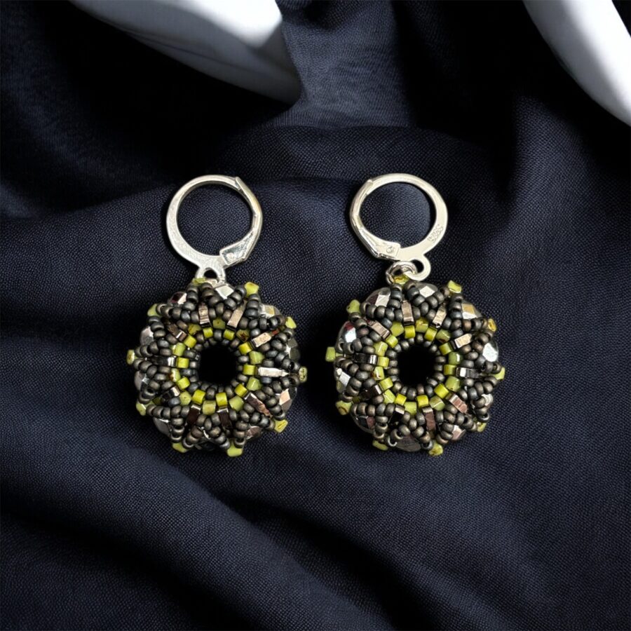 Minimalistické náušnice v temném kovovém stylu s mechově zeleným detailem.