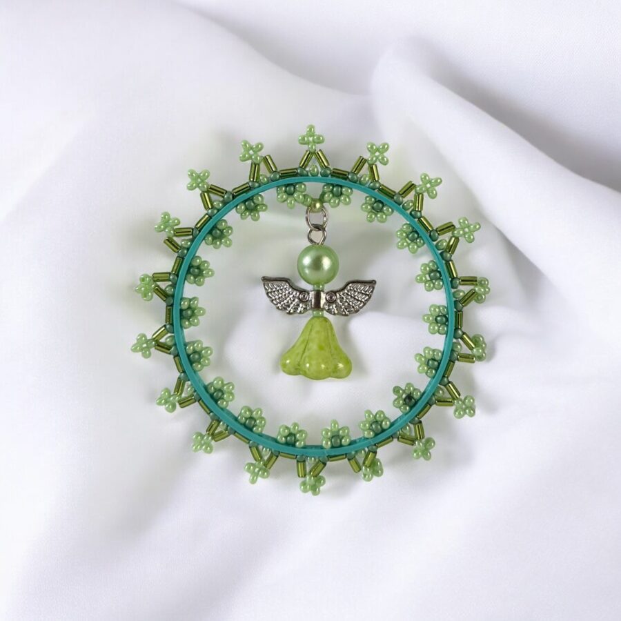 Ochranný anděl v zeleném kruhu je ručně vyrobený andělský talisman v zeleném kruhu z korálků, symbolizující ochranu, klid a harmonii. Ideální jako dekorace do bytu či originální dárek.