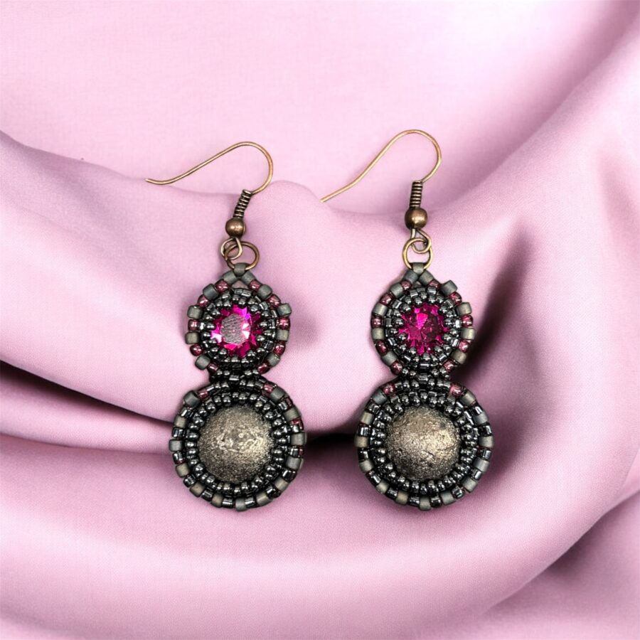 Celý šperk je ručně vyšívaný z drobných metalických korálků, které vytvářejí precizní, pečlivě navrstvené kruhové linie. Kombinace kontrastních barev – zářivě růžové a industriální bronzové – dává náušnicím jedinečnou hloubku a charakter.