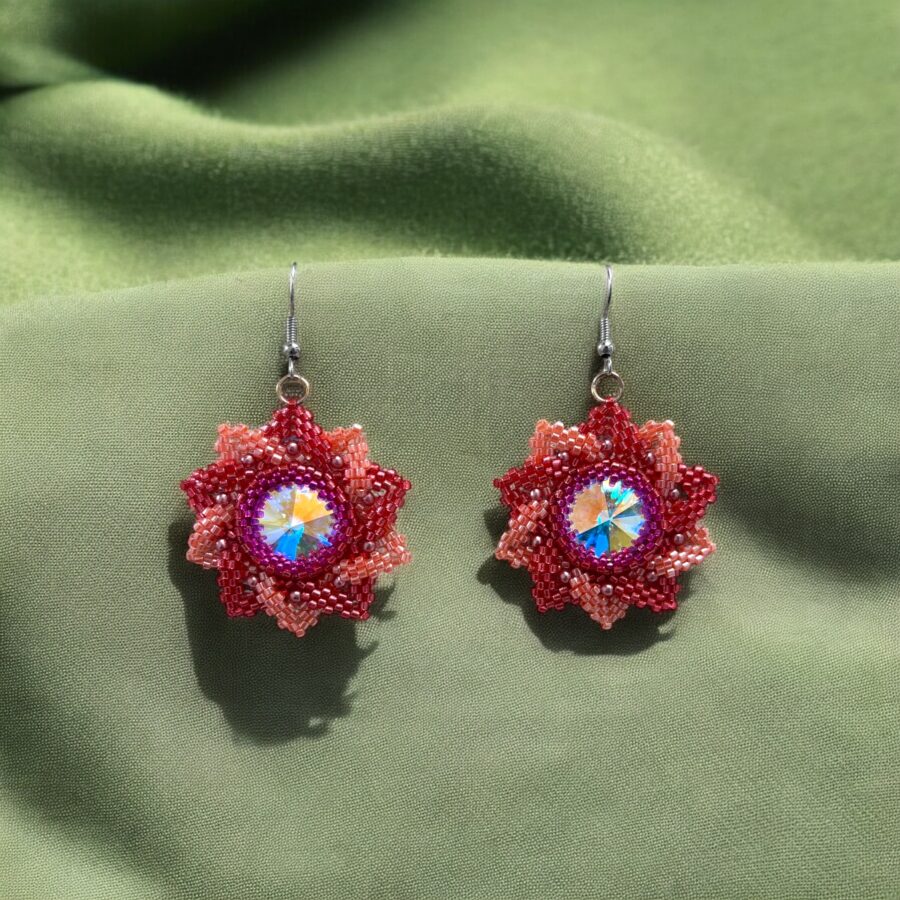 Barevné náušnice ve tvaru květu, ručně šité z drobných skleněných korálků v odstínech růžové a červené. Střed zdobí zářivý krystal s duhovými odlesky, který okamžitě přitáhne pozornost. Díky své hravosti a energii se skvěle hodí k letním outfitům i k tomu, když chcete rozjasnit svůj den. Originální ruční práce, která vám přinese radost při každém nošení.