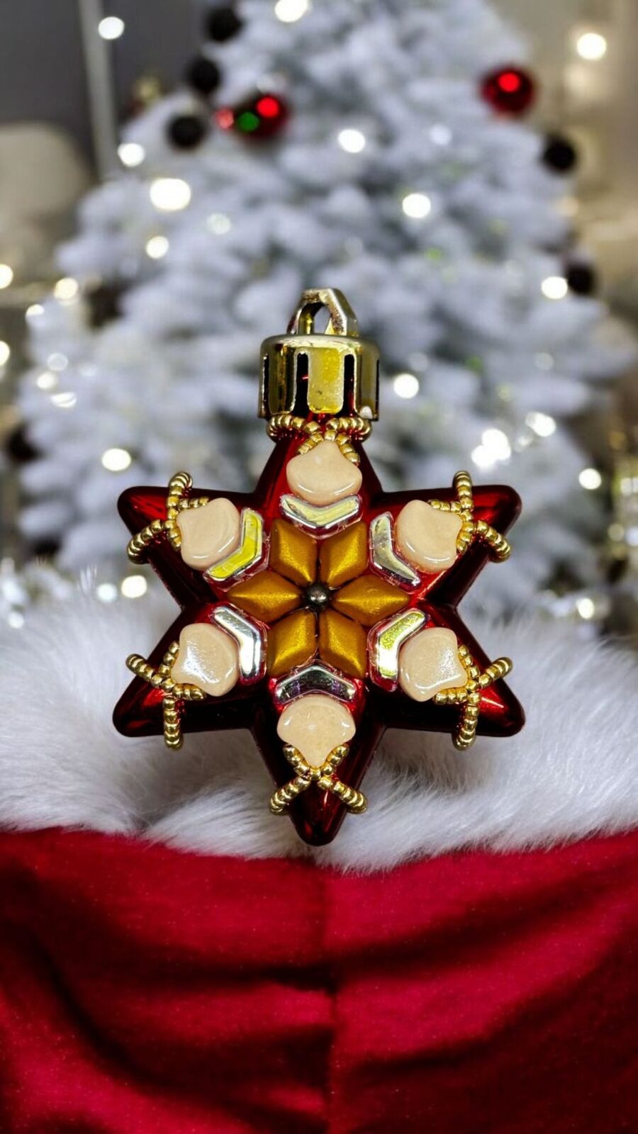 Výrazná červeno-zlatá vánoční hvězda s krémovými kamínky a luxusním centrem.
