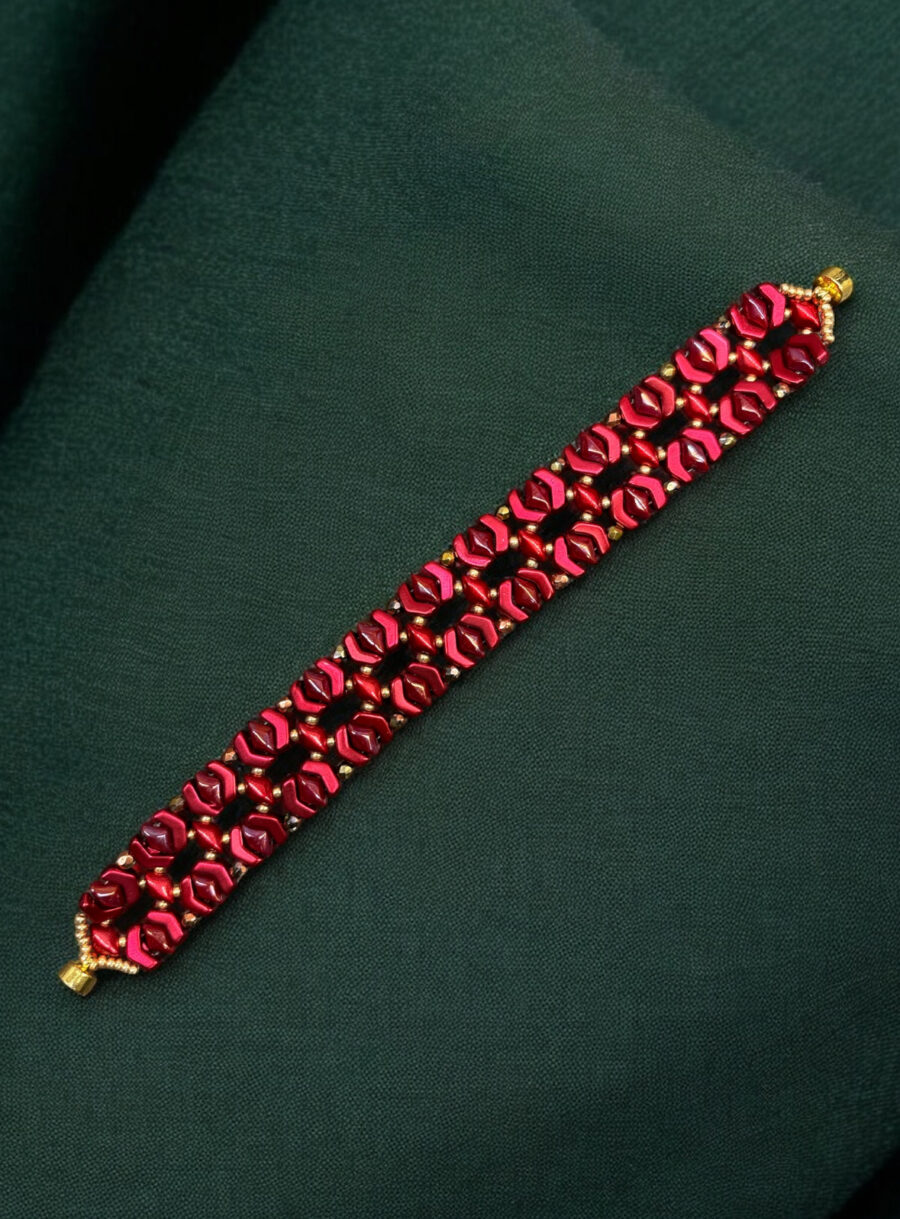 Výrazný rudý náramek s metalickým leskem a jemnými zlatými detaily. Ručně vyráběný, pevný a elegantní šperk pro sebevědomé ženy.