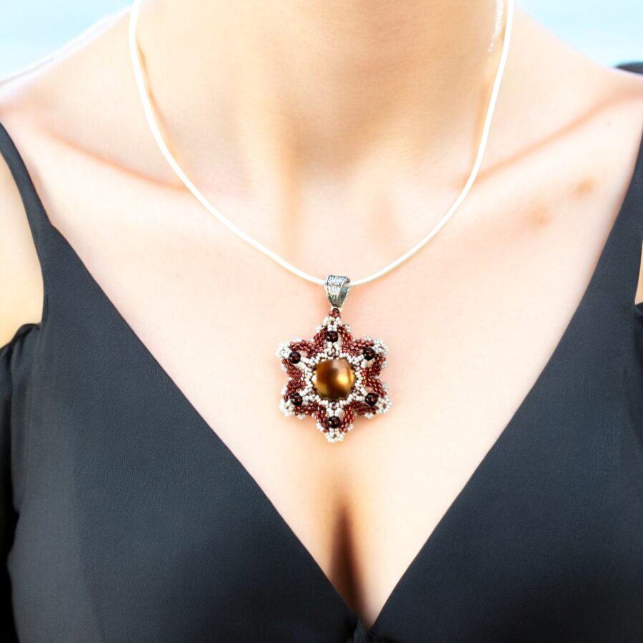 Náhrdelník „Síla ženské energie“ je šperk, který na sobě nese teplo, hloubku a smyslnost v jednom. Střed přívěsku tvoří velký, lesklý kabošon v odstínu zralého medu, který jako by zachycoval sluneční paprsky a zároveň připomínal jantar. Je obklopen bohatým korálkovým lemováním v tónech bordó, bílé a kovově hnědé, tvořícím tvar šestičetné květiny.