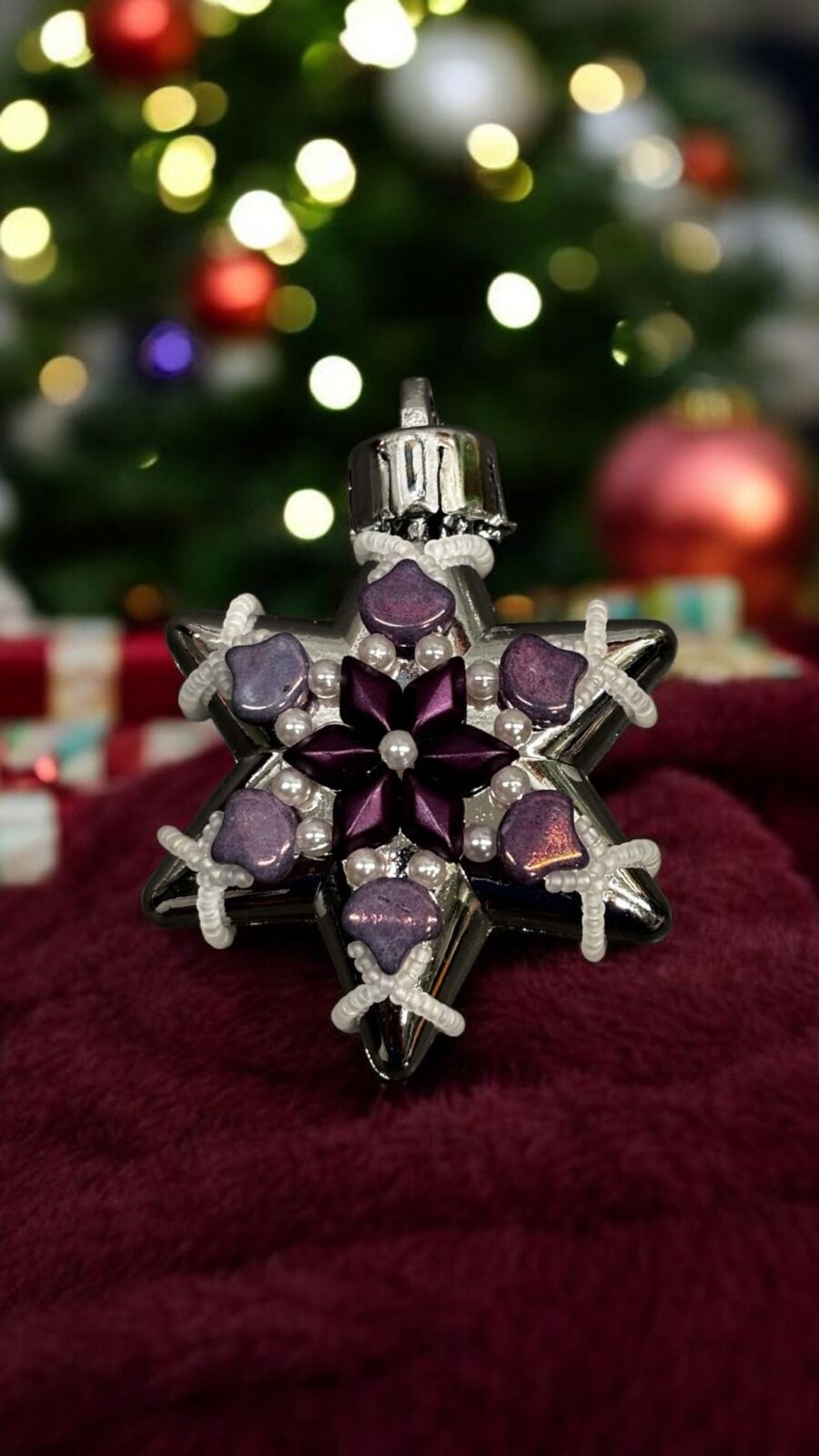 Celý motiv působí jako malý zimní šperk — něžný, třpytivý a harmonicky vyvážený. Fialové tóny dodávají ozdobě jemnou noblesu, zatímco stříbrný základ se krásně pojí se světelnými odlesky na vánočním stromku.