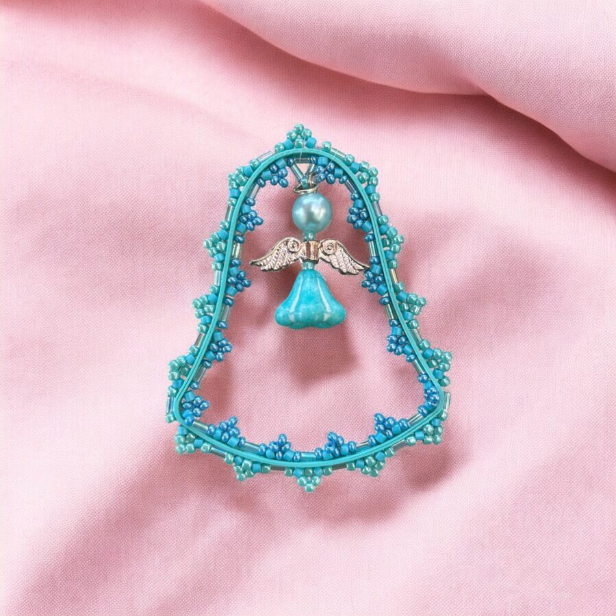 „Tyrkysový anděl“ je ručně vyráběná závěsná dekorace v podobě zvonku, jejíž střed zdobí andílek z korálků v tyrkysové barvě. Okraje jsou detailně vyšívané drobnými korálky, které dodávají dekoraci jemnost a šmrnc. Perfektní doplněk na vánoční větvičku, sváteční stůl nebo jako dárek pro někoho blízkého.