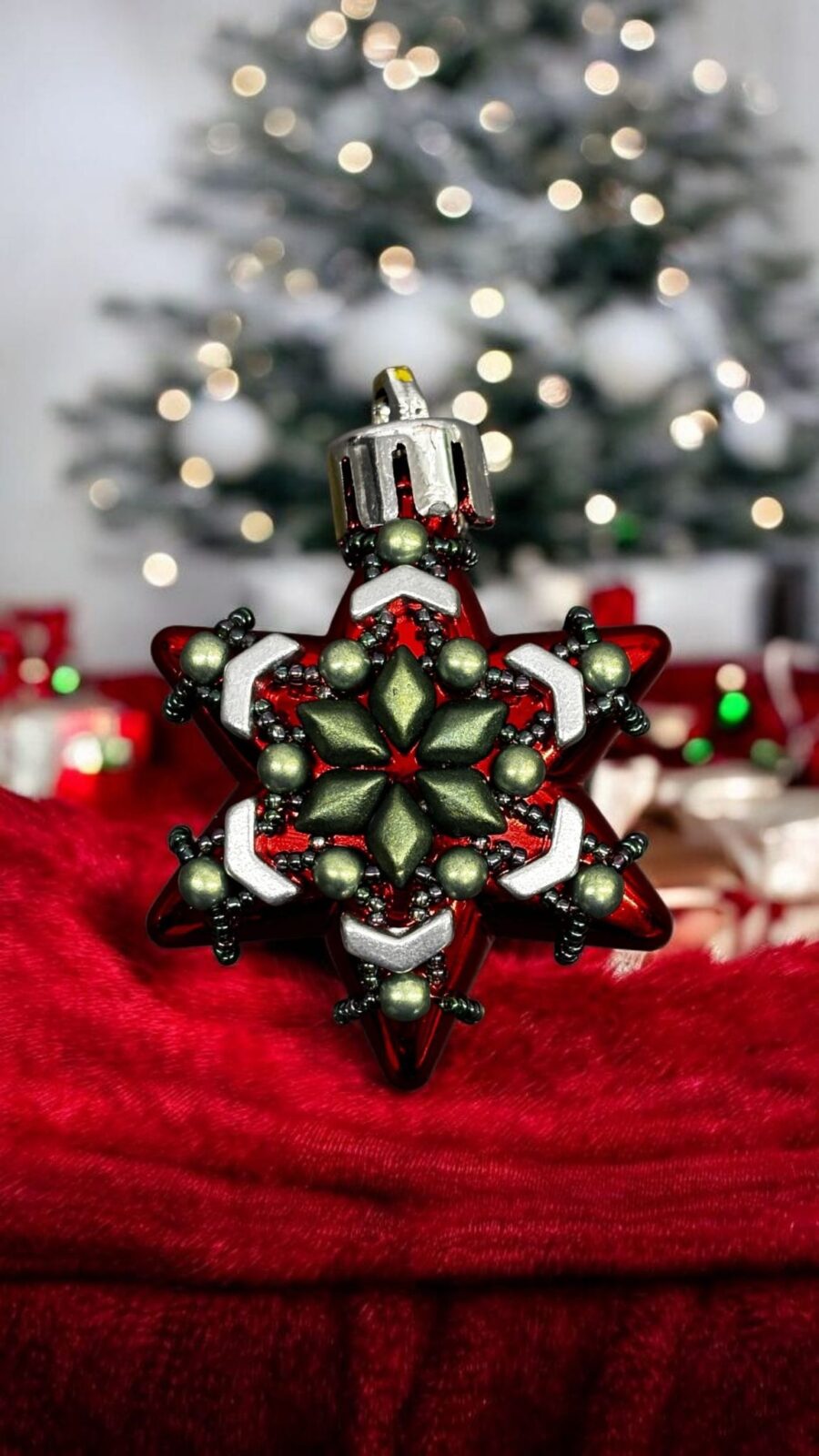 Zelená vánoční hvězda klidu je výjimečná ručně zdobená dekorace, která kombinuje tradiční vánoční barvy s moderním, luxusním zpracováním. Základ tvoří sytě červená hvězda s kovovým leskem, kterou doplňuje detailní výšivka v tmavě zelených, perlových a stříbrných tónech.