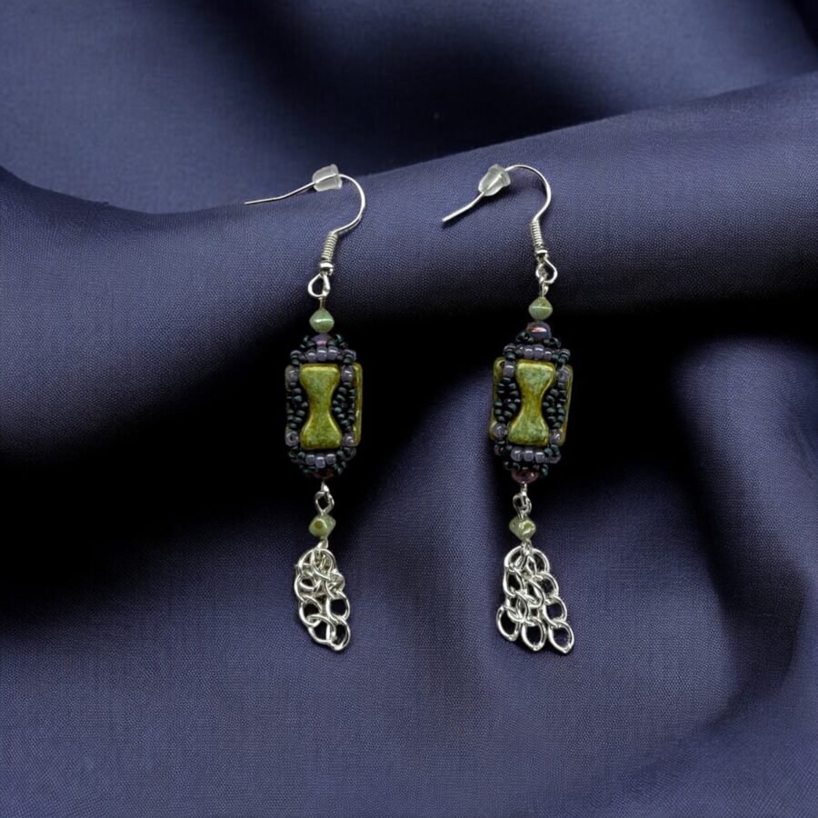 Výrazné ručně vyráběné náušnice s centrálním zeleným korálkem, lemované korálky v odstínech fialové a zlaté. Tajemný, elegantní a okouzlující doplněk s mytologickým nádechem.